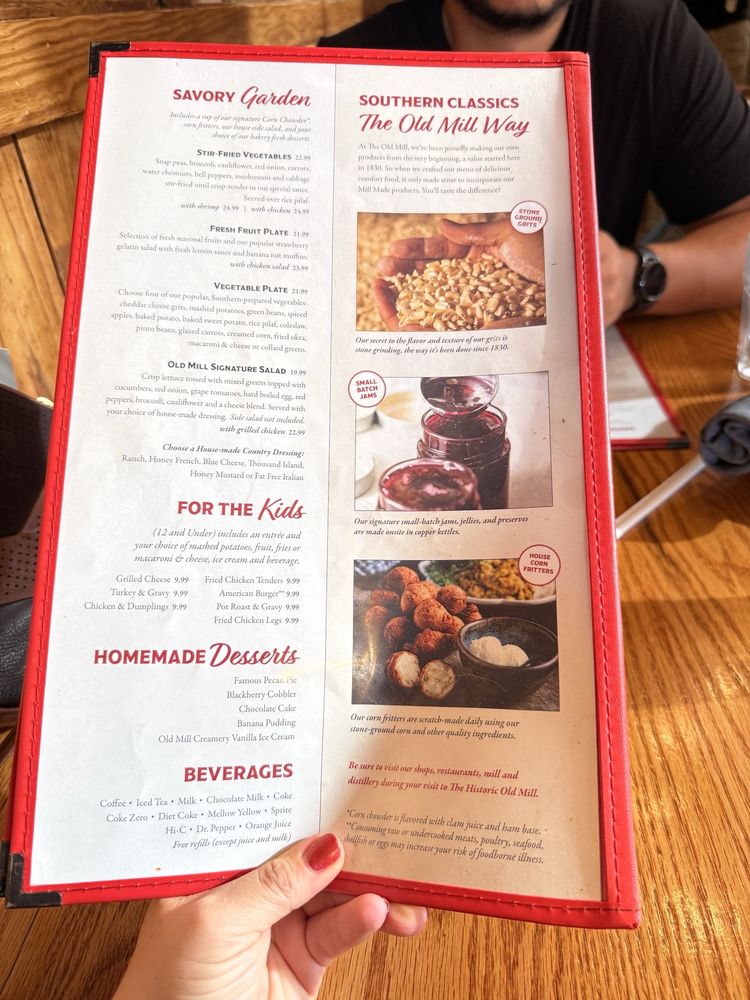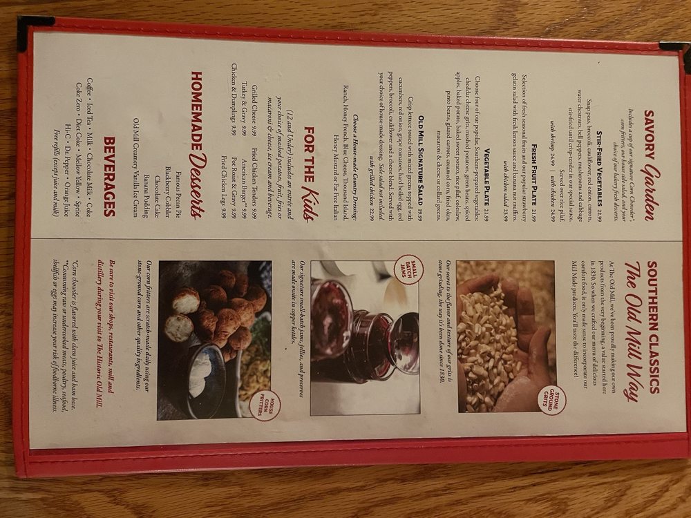 Old Mill Restaurant in Pigeon Forge, TN offers a delightful dining experience with its homemade desserts, family-style meals, and garden-fresh salads and soups. The menu features mouthwatering options like Chocolate Cake, Pecan Pie, and a hearty Family Style Meal that serves 4-6 people. Customers rave about the delectable dishes, generous portion sizes, and impeccable service. The Southern Fried selections, including Chicken Fried Steak and Chicken Fried Chicken, are highly recommended. Although alcoholic beverages are not served, the restaurant's efficiency in seating, order placement, and service ensure a pleasant dining experience. With ample seating, parking, and a charming ambiance, Old Mill Restaurant is a must-visit for those craving classic American comfort food.